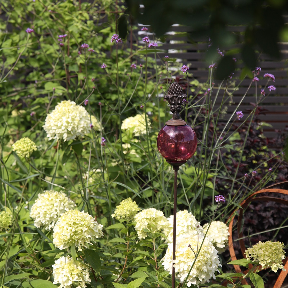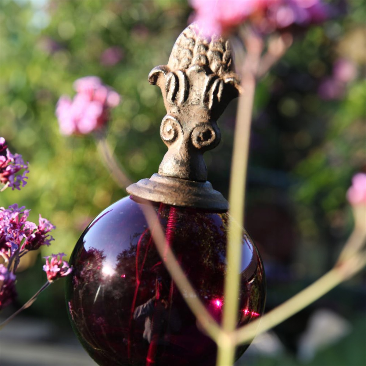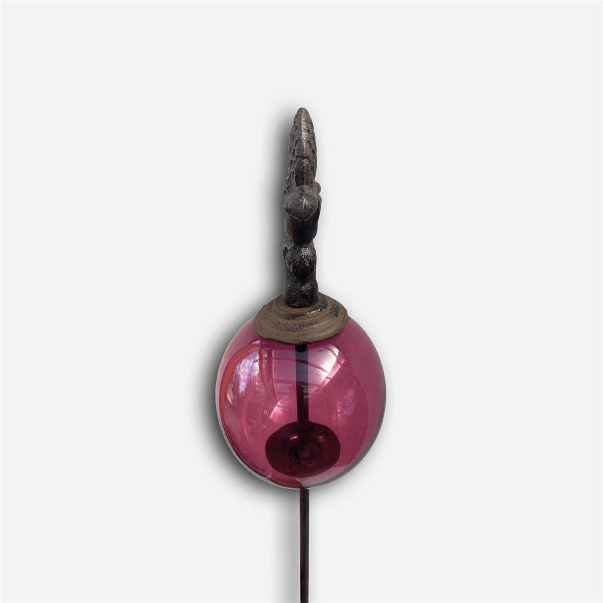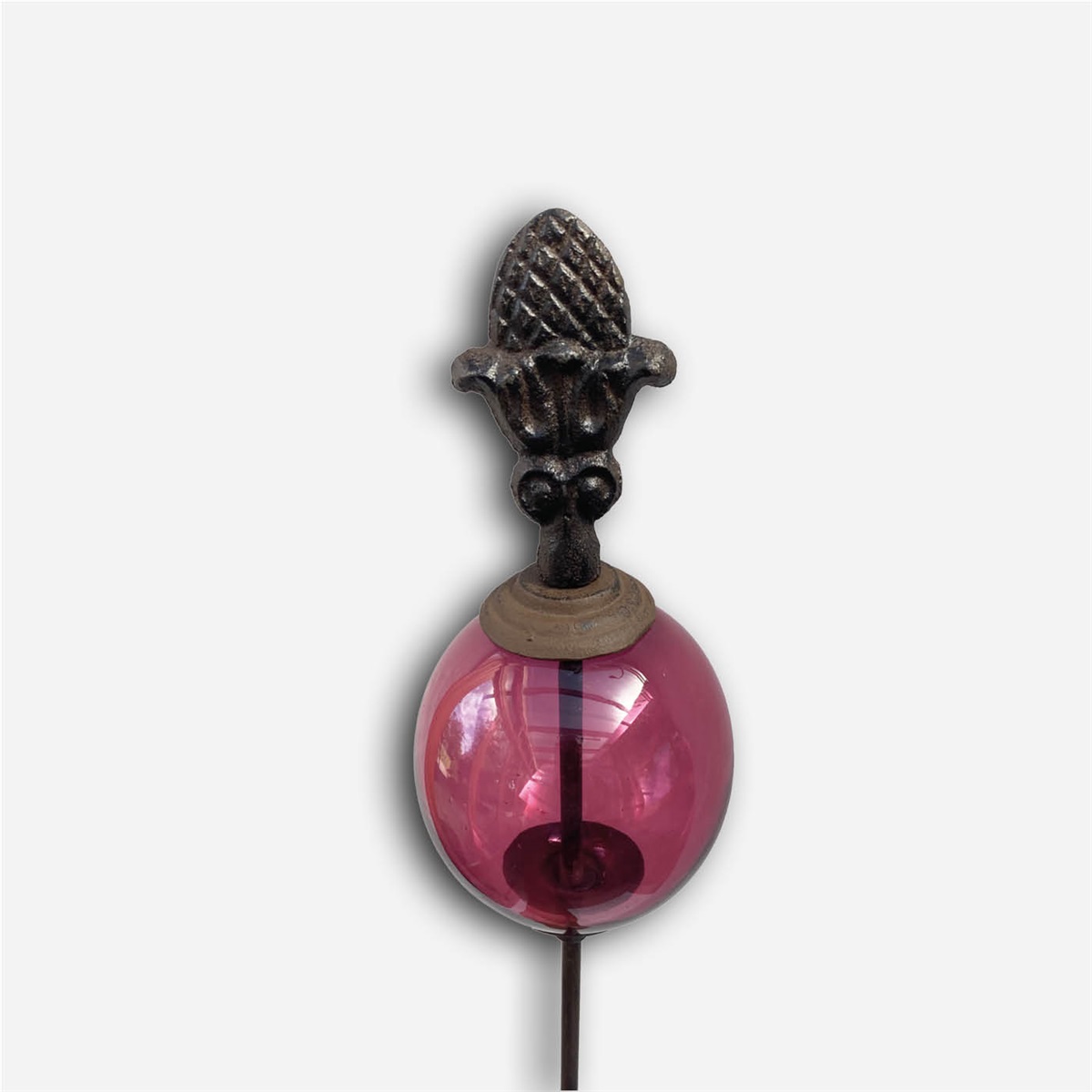 En stämningsfull trädgårdsdekoration med vackert formad topp och skimrande glaskula i djupt röda toner. Rosenkulan fångar ljuset och skapar liv i rabatten, krukan eller bland grönskan.