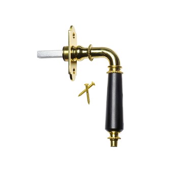 Polerad, obehandlas mässing och svartbetsat handtag av lövträ. Ett set innehåller, 1 st trycke (1del), 1 täckbricka och 2 st spårskruvar. Fyrkantsstången 8mm x 8mm x 43mm lång, det vill säga passar till de flesta infällda espanjoletter på marknaden. Tjocklek fyrkantsstång 0,8×0,8cm. Längd fyrkantsstång 4,3cm