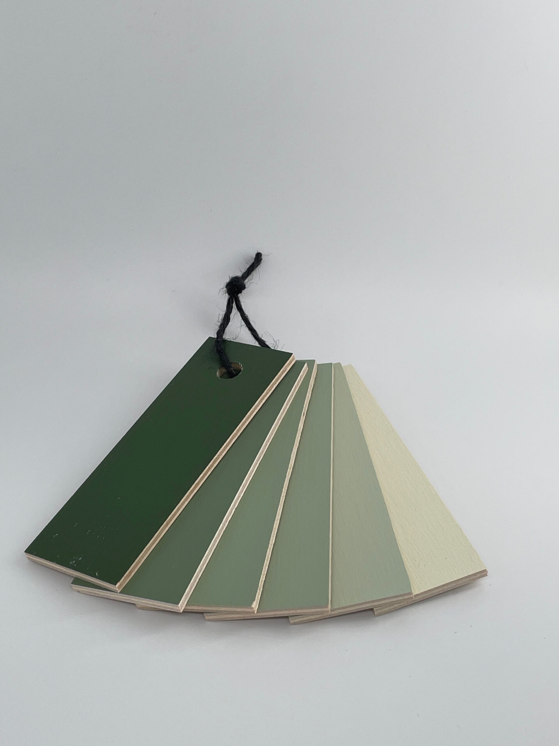 Ett set med alla våra linoljefärgskulörer uppmålade på träbitar.