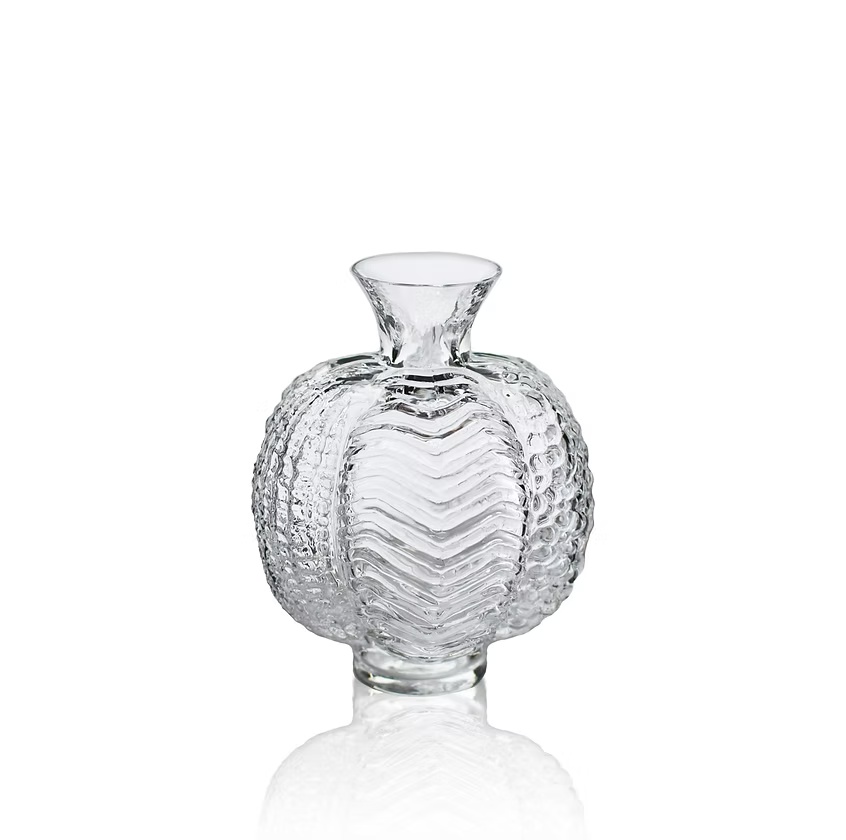 FRÖ är en liten glasvas inspirerad av naturens egna frökapslar – deras mjuka former, spänst och inneboende kraft. Den organiska siluetten ger ett levande uttryck, där ljuset fångas och speglas i det klara glaset.