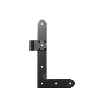 Obehandlat järn. Gångjärnet skruvas vid den nitade delen och spikas för övrigt. Längd 9cm, höjd 16.5cm, tjocklek 1.5mm, bredd 2.2cm. Passande skruv nr 12.
