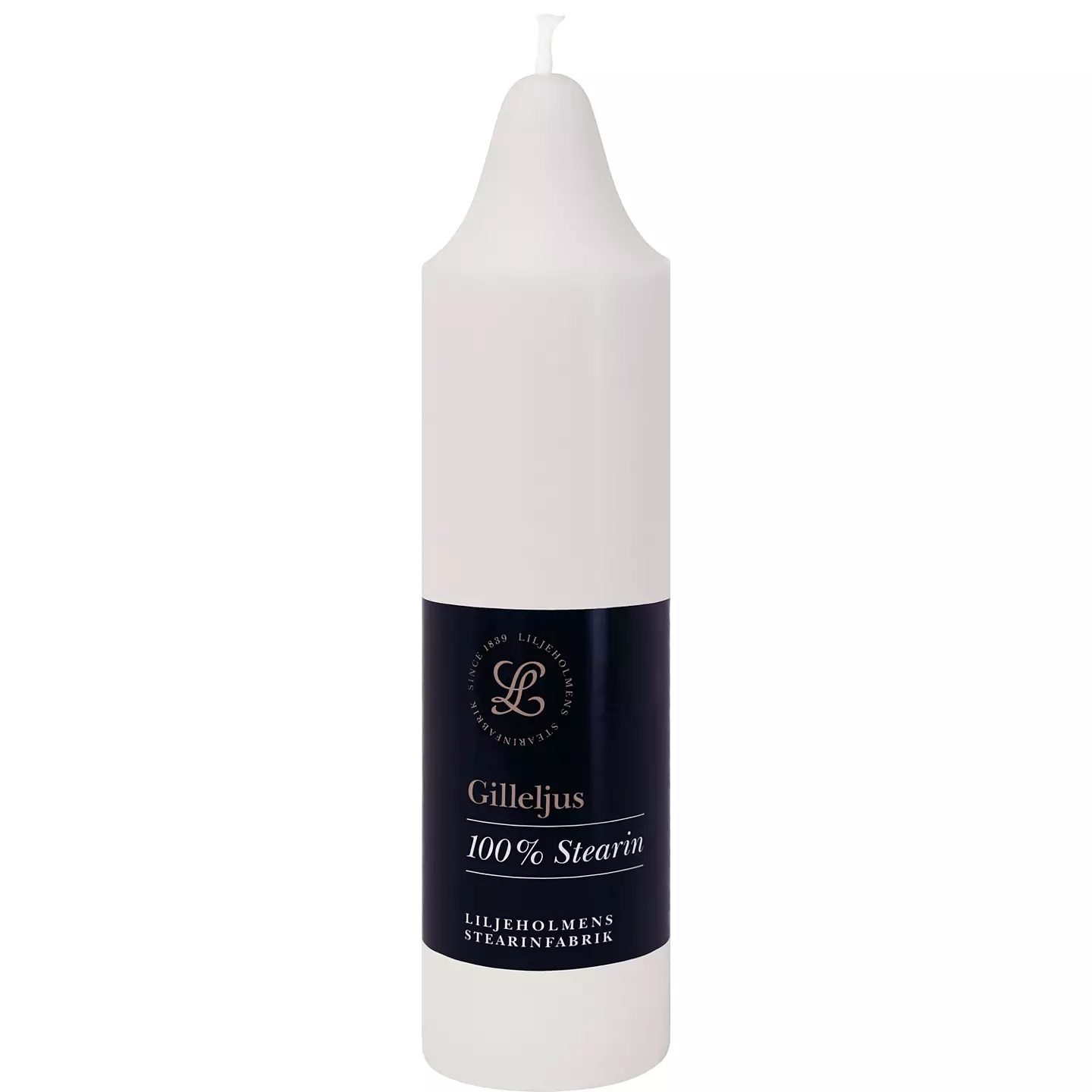 Ett tidlöst och klassiskt stearinljus från Liljeholmens. Gilleljuset kännetecknas av sin vackra klockformade topp, rena vita färg och långa brinntid. Ljuset är tillverkat av 100% stearin, vilket ger en stabil, klar låga och minimalt med rök.