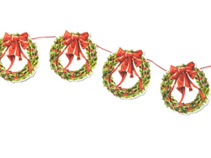 En vacker stansad och präglad girlang med tio upprepande bilder av en viktoriansk julkrans med glittrande rött glitter. Julkransen är dia 14,5 cm och ca 3 m lång, enkelsidig.