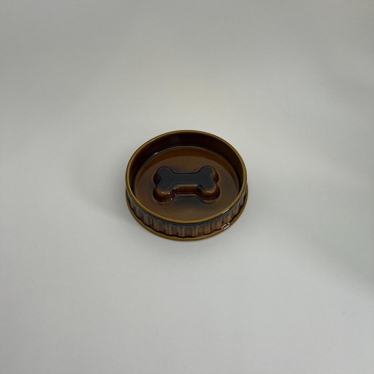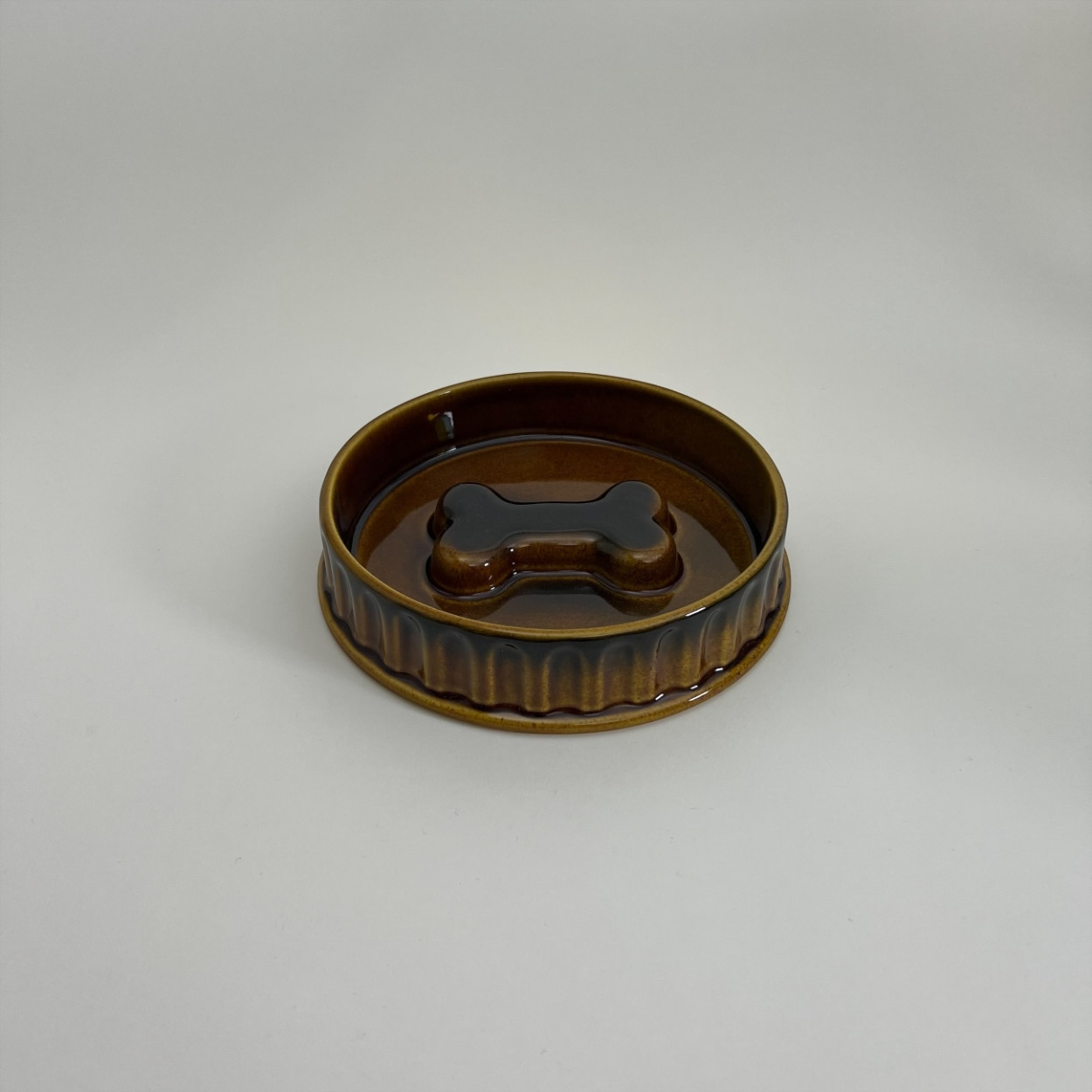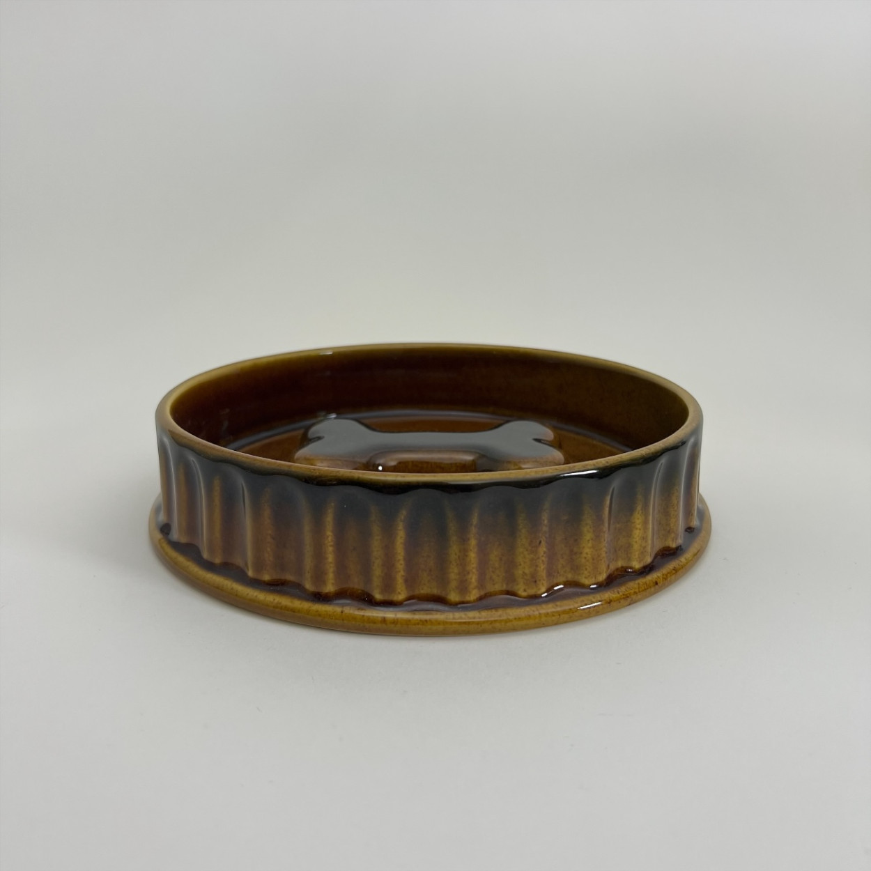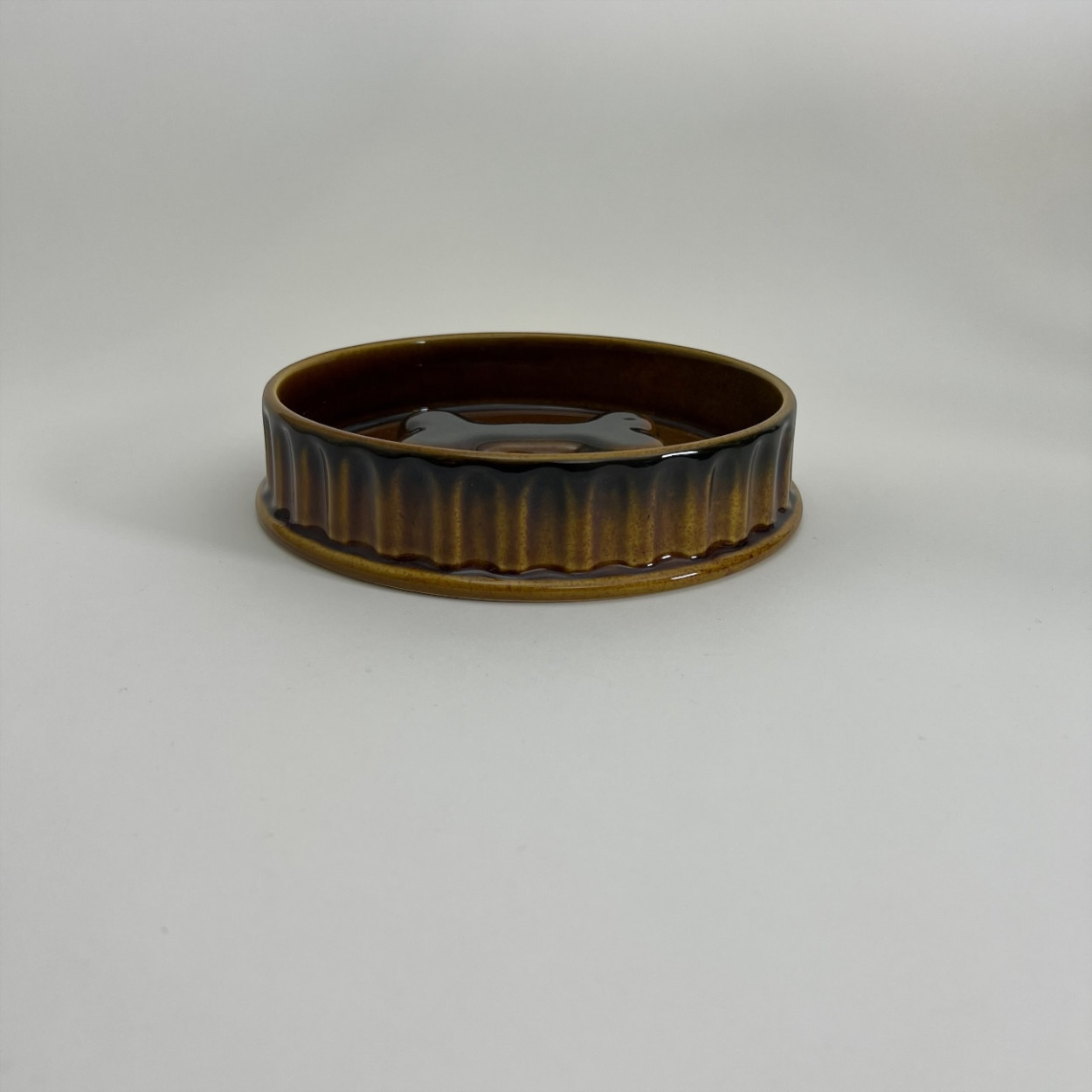 En stadig och vackert glaserad hundskål i keramik med varm brun ton och dekorativ benformad detalj i botten. Skålens räfflade utsida och tidlösa färgskala ger ett klassiskt uttryck som passar lika bra i kök som i hall eller groventré.