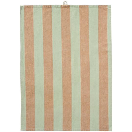 Klassisk kökshandduk i 100 % bomull med breda ränder i ljusgrönt och ljusbrunt. Handduken har god uppsugningsförmåga och en slitstark kvalitet som gör den både praktisk i vardagen och dekorativ i köket.