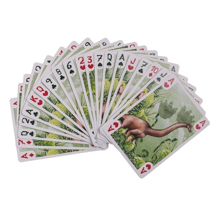 Kortleken innehåller 54 spelkort med illustrerade dinosaurier, fotspår och förhistoriska detaljer. En rolig och lekfull variant av den traditionella kortleken som passar lika bra till familjens spelkväll som på resan eller i sommarstugan.