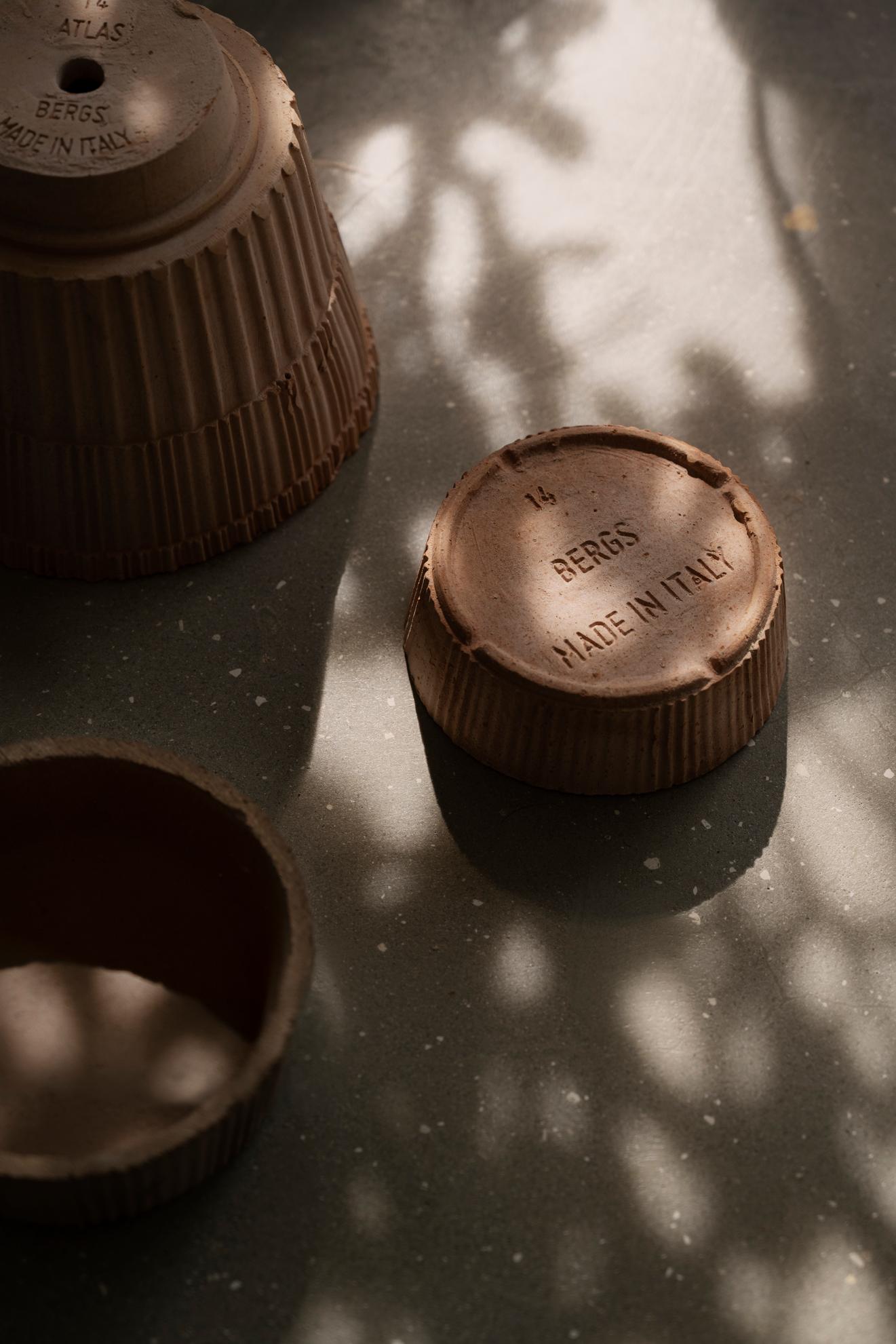 Atlas-krukan i kraftig terrakotta, designad för att stå på axlarna av dess motsvarighet i tefatet.