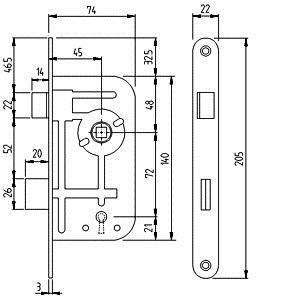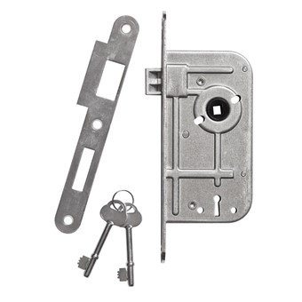 Låshus och låsbleck i förzinkat stål. Levereras med två nycklar och slutbleck. Fallkolven är vändbar vid demontering, dvs ett högerlås kan göras om till ett vänsterlås och vice versa. Motbleck medföljer. Lika låsning med lika nyckel till flera lås kan specialbeställas. Dorndjup 4.5 cm