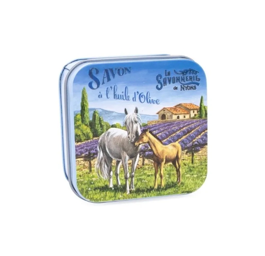 En väldoftande fast tvål med klassisk rosdoft, förpackad i en dekorativ plåtask med motiv från den franska landsbygden. Tvålen är berikad med sheasmör och olivolja från Nyons, vilket hjälper till att vårda och mjukgöra huden vid varje tvätt.