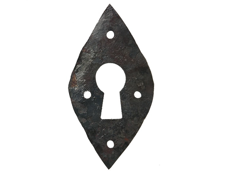 Handsmidd nyckelskylt till 1700-tals kammarlås och andra lås med liknande nyckelstorlek. Den spetsovala formen på skylten är typisk för 1700-talet, men modellen finns kvar även några decennier in på 1800-talet.