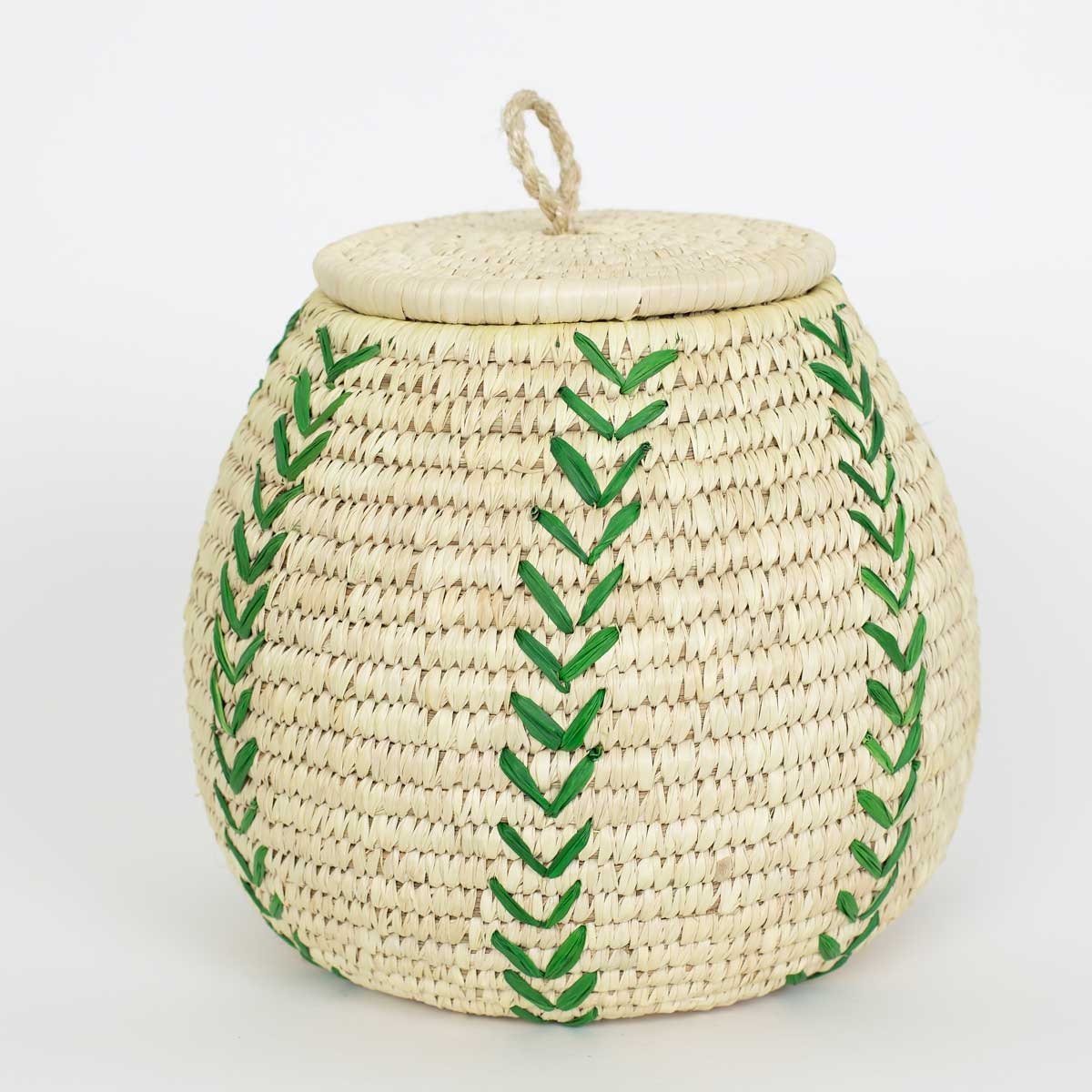 En vacker handflätad korg i palmblad med dekorativa gröna sömmar som löper som blad längs sidorna. En fin kombination av naturmaterial och detaljarbete som ger korgen ett levande och personligt uttryck.
