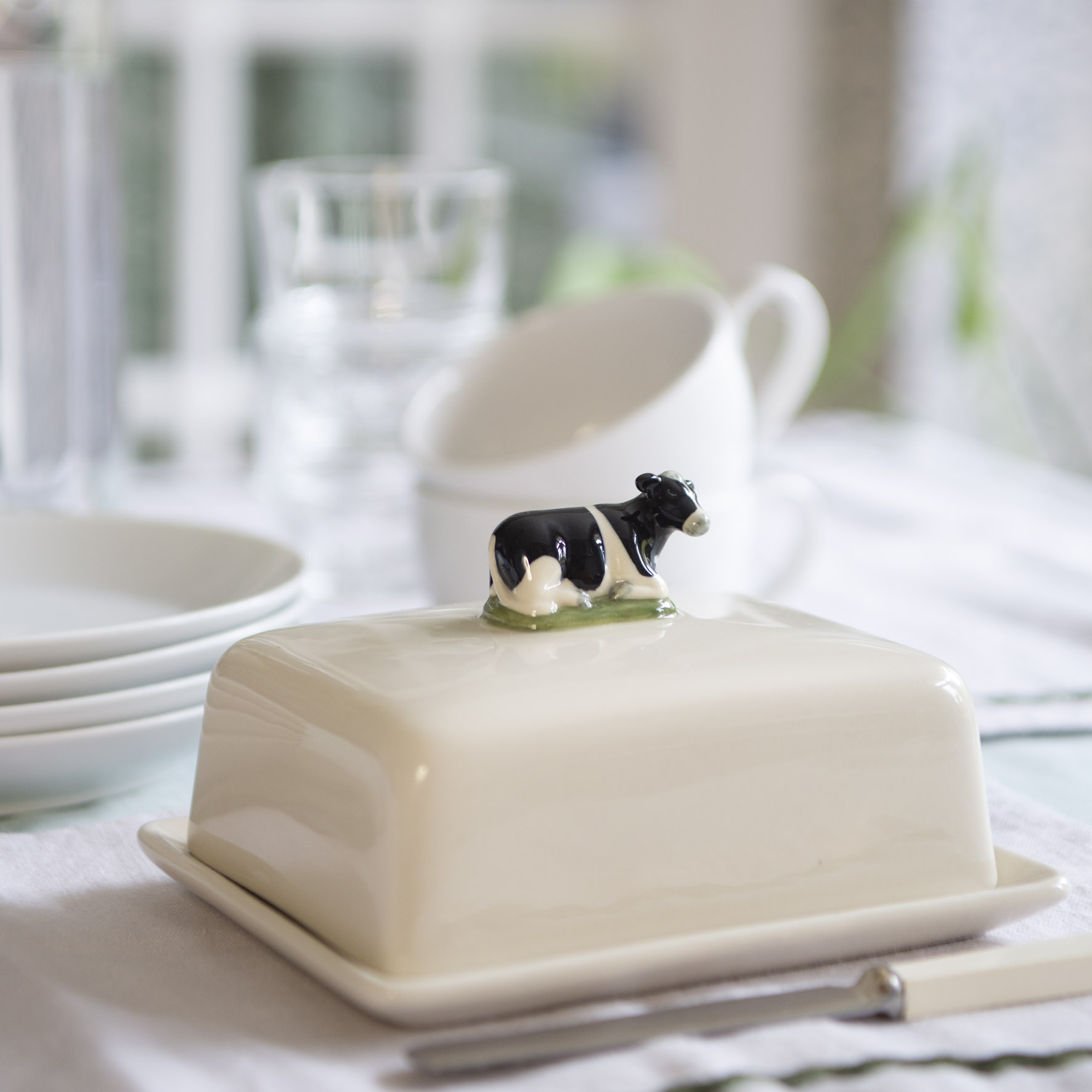Låt bondgårdscharmen flytta in på ditt bord med Quail “Cow” Butter — en handmålad smörbytta i stengods prydd med en söt kofigur på locket. Denna lekfulla och funktionella bytta kombinerar dekorativt uttryck med praktisk användning och fungerar lika bra vid vardagsdukning som vid festligare tillfällen.