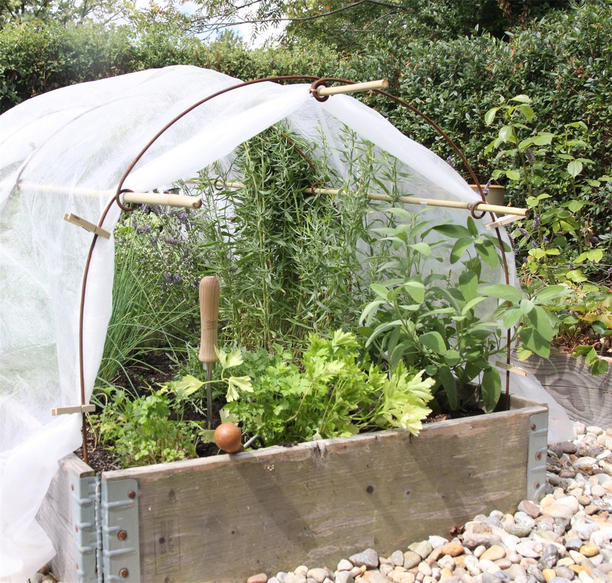 Placera bågarna efter varandra och trä en bambupinne igenom. Täck med fiberduk eller växtplast och fäst gärna några klädnypor.