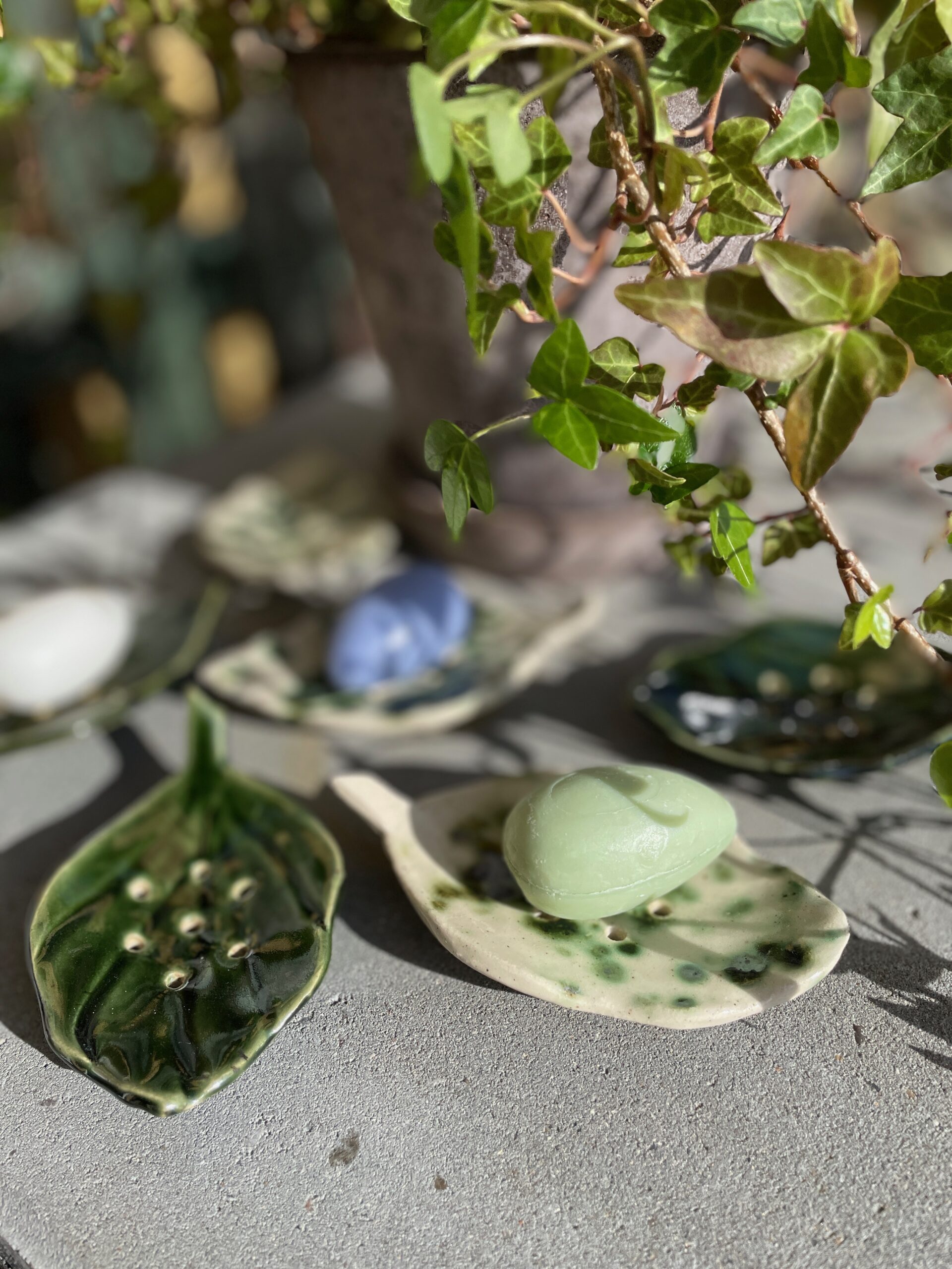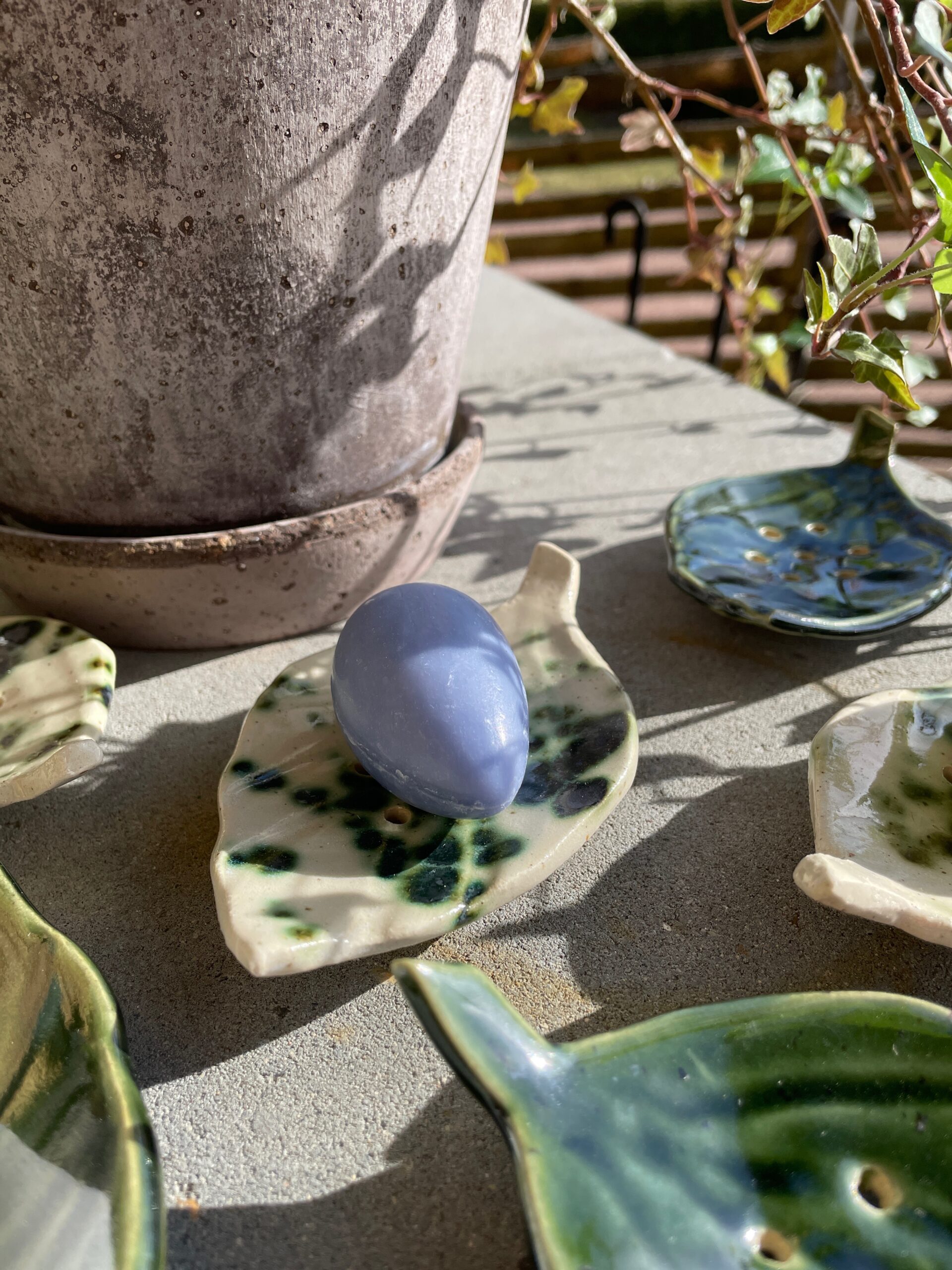 Vackert tvålfat i form av ett blad, lokalt tillverkat för hand av keramikern Emelie Wedhall. Varje fat är unikt med levande glasyr och små variationer som vittnar om det genuina hantverket.